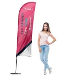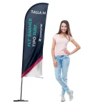 Este banner con forma de gota da un espectacular efecto publicitario. Es ideal para eventos temporales y publicitar productos y ofertas. Se suele utilizar cada vez más en ferias y eventos.