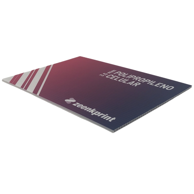 Debido a sus características, y a las novedosas técnicas de impresión que utilizamos en Zeenkprint, el polipropileno celular se convierte en un producto recomendado para exteriores, adaptándose a la perfección a las condiciones climatológicas adversas. Si buscar productos con más cuerpo para interior, recomendamos el Cartón Pluma. Si lo que está buscando es una mejor calidad del material y más consistencia para sus diseños recomendamos el PVC-FOREX ó el Diboun de Aluminio.