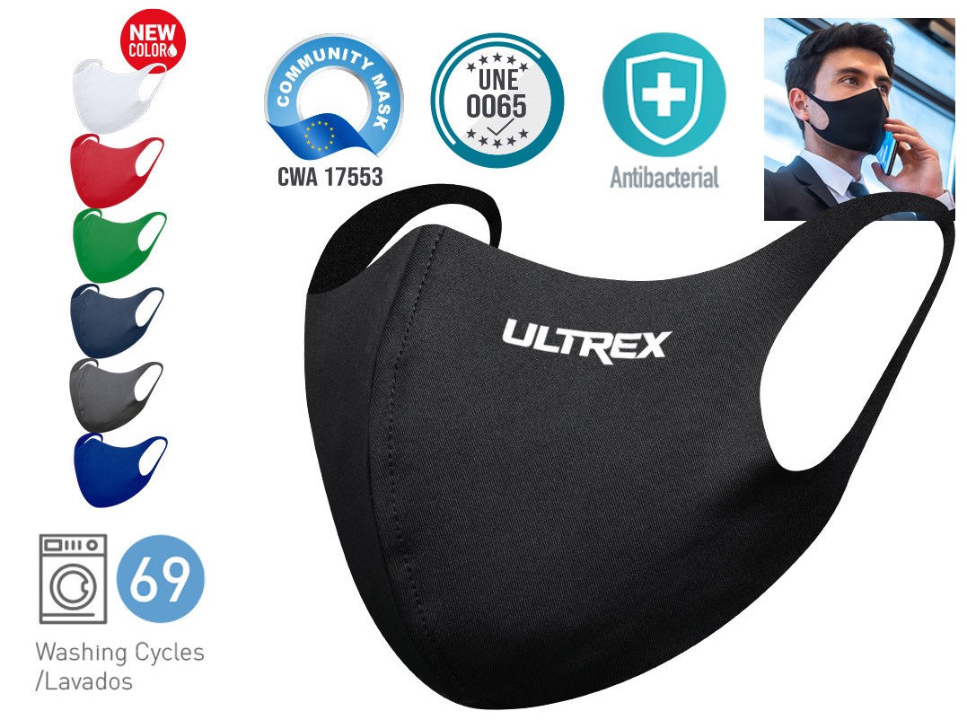 Mascarilla higiénica reutilizable elástica. Fabricada en tela soft shell, con propiedades hidrófugas y antibacterianas. Costura frontal ergonómica para un cómodo ajuste en boca y nariz. Disponible en sobria gama de colores.